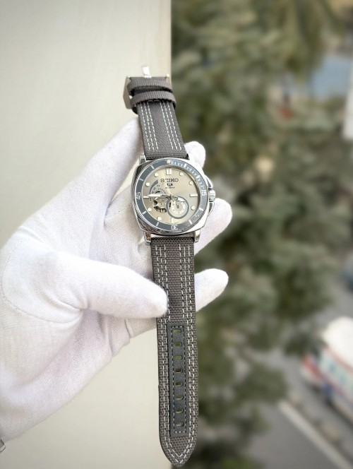 Seiko 5 Sports watch with a grey fabric strap and a Gradient Grey dial. The watch features a stainless steel case and luminous hands and markers. The watch also has an open heart design, showcasing the automatic movement.